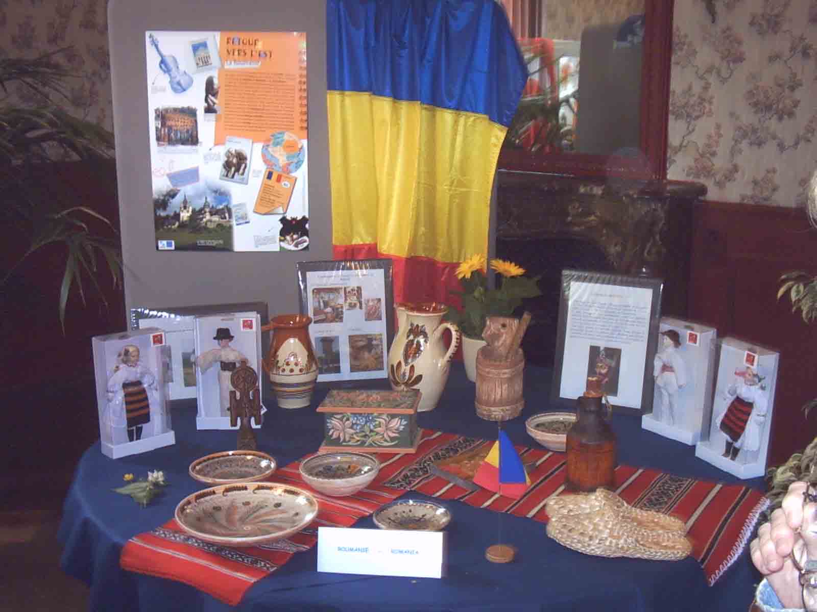 Le stand de la RoumanieLe stand de la Roumanie se situe juste à droite de celui de la Bulgarie et attire lui aussi beaucoup de monde. Sa table est richement couverte d'affichettes explicatives, d'objets décoratifs divers, de poterie et de vaisselle. Cela ne laisse pas de place à la dégustation. Peu importe, après tout on n'est pas là pour ça mais bien pour apprécier la présentation qui est ici faite des pays de l'Est et de nos nouveaux voisins européens. ![]()