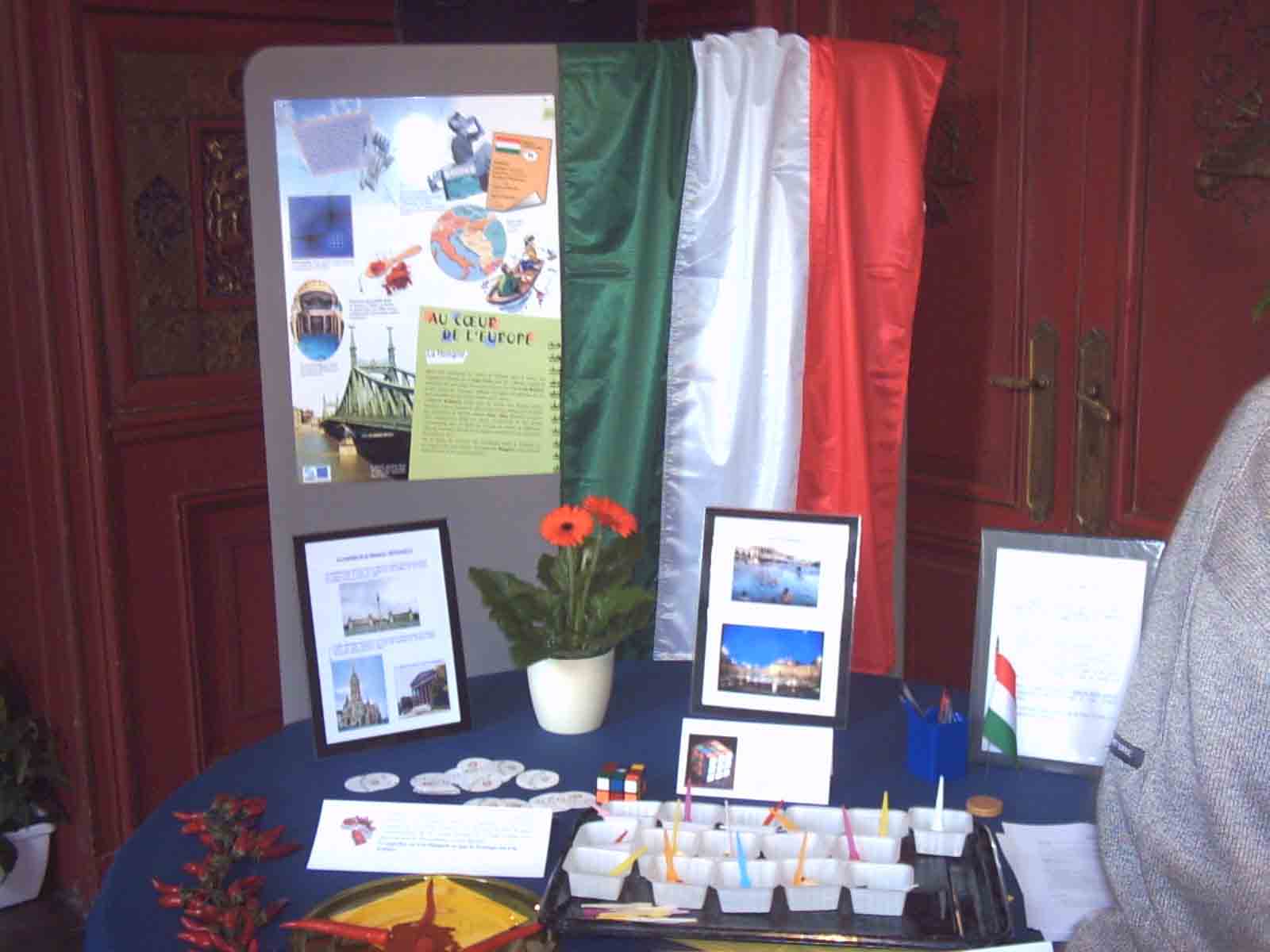 Le stand de la Hongrie...Et le dernier stand que nous visiterons pour aujourd'hui, le dernier qui se trouve à l'intérieur du superbe château d'Enghien, est celui de la Hongrie. Mis à part les traditionnelles affiches explicatives, avec quelques photos en prime, la table est surtout décorée de fleurs et de poivrons. Il y est servi de petites portions de fromage piquant avec des tranches de poivrons dont nous nous sommes servis...OK. Vous connaissez la suite! ![]()