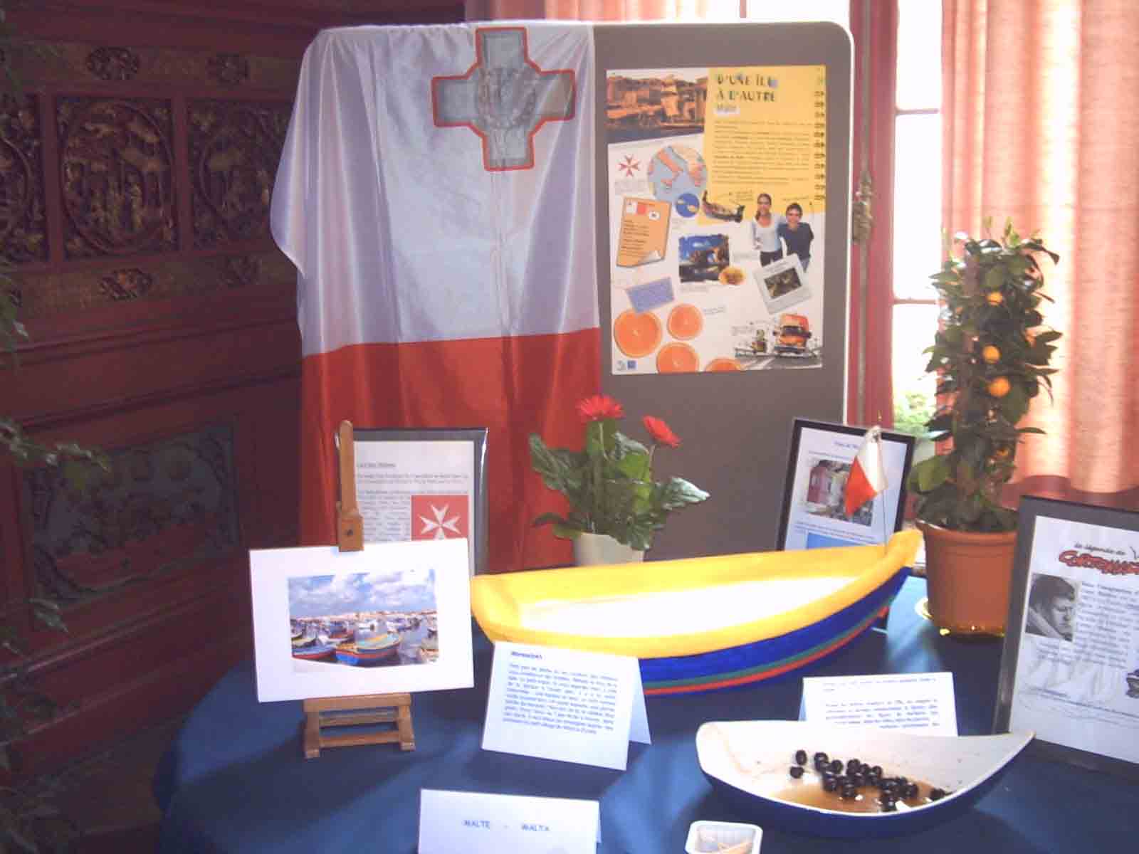 Le stand de MalteLe stand de Malte était lui aussi très prisé par les visiteurs en quête de renseignements sur nos nouveaux voisins européens. Situé dès l'entrée de la première pièce à droite dans le hall d'entrée du château d'Enghien, il se démarquait immédiatement par la présence d'un canot sur la table. Le visiteur avait, comme à chaque stand, droit à quelques affichettes de présentation sur le pays et ses particularités et, ici, on apercevait un chapitre sur Corto Maltèse (seuls les habitués de la bande dessinée comprendront!). En guise de petite dégustation on nous propose ici d'excellentes olives noires et vertes dénoyautées. On pourrait presque dire que les visiteurs sont soignés "aux petits oignons", ce n'est pas exagéré et, à certains endroits, on a même droit aux cornichons et aux concombres. ![]()