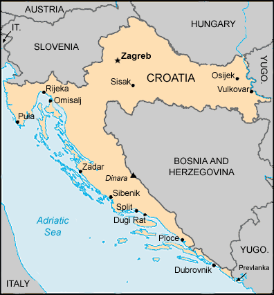 La République de Croatie s'étend sur 56.538 km². Son littoral, bordant la mer adriatique sur 5740 km, est émaillé de 1185 îles. La Croatie compte un peu plus de 4.3 millions d'habitants. Sa langue officielle est le croate, son écriture officielle l'écriture latine. La partie continentale du pays appartient à l'Europe centrale, sa partie littorale à la sphère méditerranéenne.