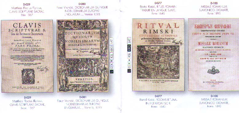 Le slavon - Au Moyen Age, dans les territoires croates uniquement, il était une langue sacrée, l'une des langues de l'Eglise. Cependant, avec le temps, il connut des changements: plus le croate s'éloignait du slavon, plus les copistes et les imprimeurs étaient hésitants. Ainsi vit-on très tôt y pénétrer des croatismes qui nous donnent de précieux renseignements sur l'origine des manuscrits et livres imprimés.