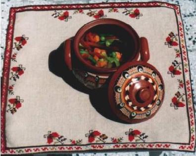 Habituellement, on le prépare dans des pots de terre, c'est de là que vient le nom ("guvétché" en bulgare veut dire "pot" en français). Mais...bon, revenons donc à notre plat au mouton: