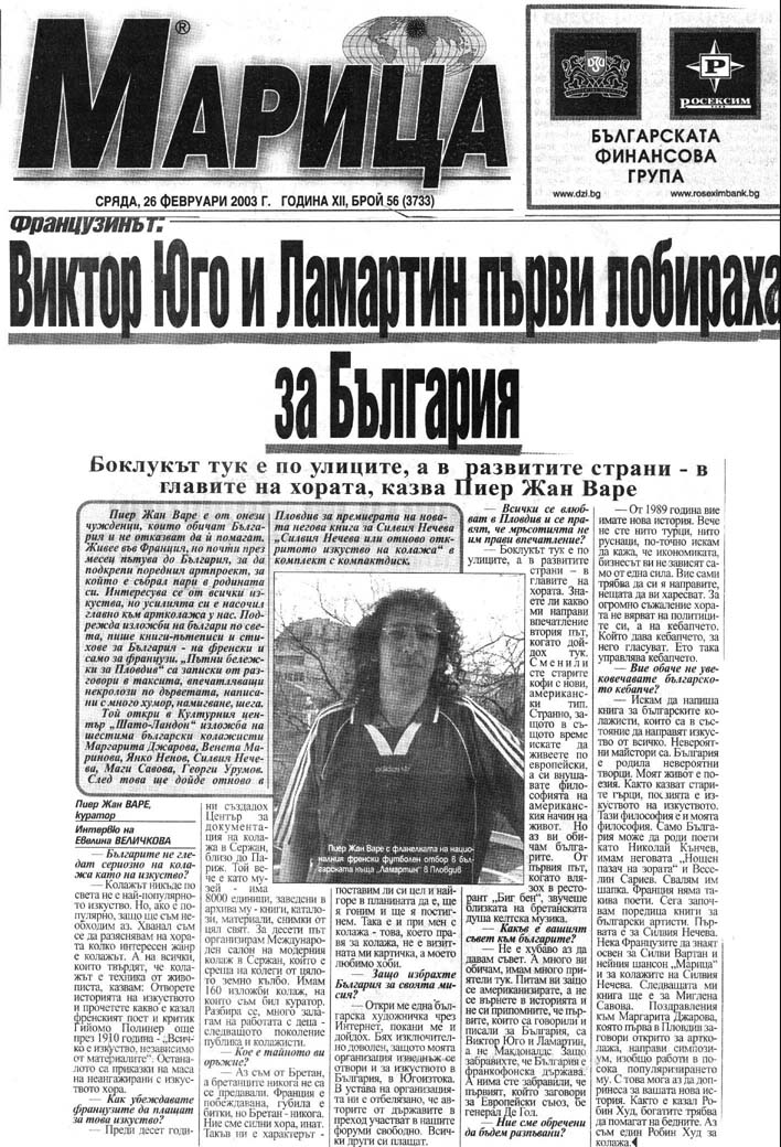 - Je veux ecrire un livre sur les collagistes bulgares qui sont capables de faire l'art de tout. Ils ont des maîtres incroyables. La Bulgarie a fait naître des auteurs incroyables. Ma vie est poèsie. Comme les anciens Grecs le disent, la poèsie est l'art de l'art. Cette philosophie est ma philosophie. Ce n'est que la Bulgarie qui sait faire naître des poètes tels que Nikolaï Kantchèv, je possède son "Veilleur de nuit de l'aurore" et Vésséline Sarièv. Je leur tire mon chapeau. En France il n'y a pas de tels poètes. Maintenant je commence une série de livres sur des artistes bulgares. Dans le premier il s'agira de Silvya Nétchèva. Que les Français connaissent non seulement Sylvie Vartan et sa chanson "Maritsa" mais aussi des collages de Silvya Nétchèva. Mon livre suivant sera consacré à Migléna Savova. Mes félicitations à Margarita Djarova qui la première a parlé ouvertement à Plovdiv de l'art du collage, qui a fait un symposium et travaille pour sa popularisation. C'est juste cela que je peux apporter dans votre nouvelle histoire. Comme Robin Hood le disait, les riches